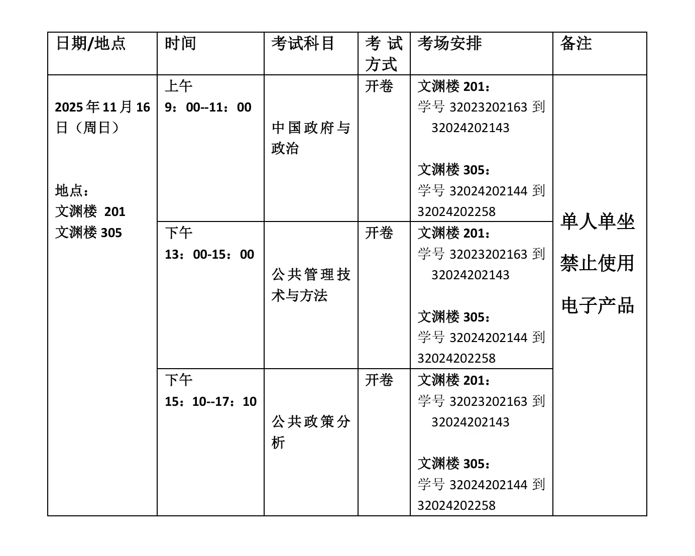 2025年秋季学期2024级MPA周末班考试日程