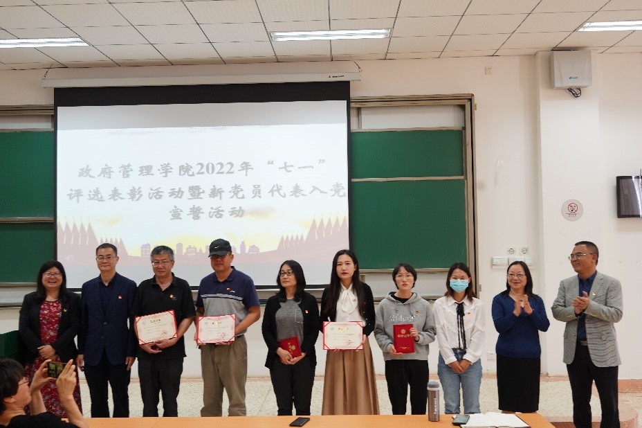 为教育引导广大师生党员不忘初心、牢记使命,增强“四个意识”,坚定“四个自信”,做到“两个维护”,忠诚拥护“两个确立”。结合实际,2022年6月17日,政府管理学院党委2022年“七一”评选表彰活动暨党员代表入党宣誓活动在云南大学呈贡校区文汇楼2218举行。