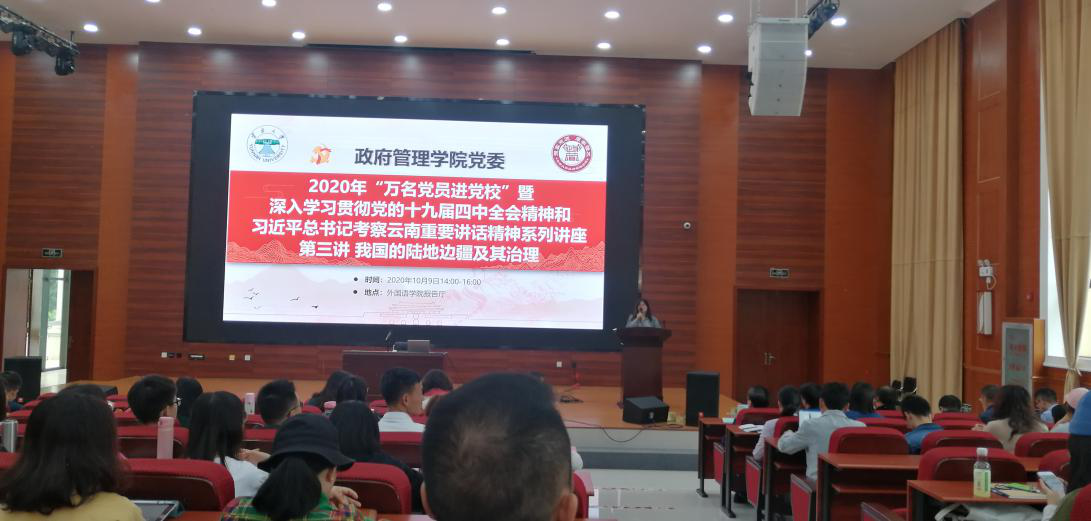 为深入学习贯彻党的十九届四中全会精神和习近平总书记考察云南重要讲话精神,巩固拓展“不忘初心、牢记使命”主题教育成果,有效抓实党员学习教育,2020年10月9日下午14:00-16:30,政府管理学院开展“万名党员进党校”暨深入学习贯彻党的十九届四中全会精神和习近平总书记考察云南重要讲话精神系列讲座第三讲《我国的陆地边疆及其治理》。本次培训由政府管理学院党委李娟书记主持,政府管理学院院长、边疆治理研究中心主任、博士生导师方盛举教授主讲。