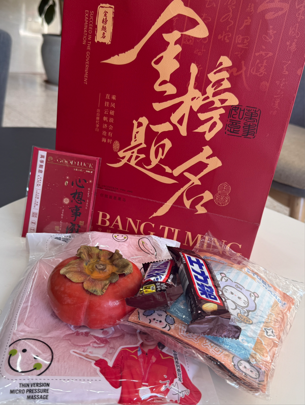 活动现场,一份份承载着学院深情厚谊的考研祝福礼包整齐排列,散发着温馨与期待的气息。姜绍勇书记亲自为同学们悉心讲解礼包中的每一样礼物:驱散冬日寒意的热水袋和暖宝宝、注入满满活力的士力架、“柿柿”如意的脆柿和“上上签”祝福贺卡。一份份精心准备的慰问品通过老师们的双手传递到了同学们手中,它们不仅仅是物质上的馈赠,更是学院对即将征战考场的学子们深深的关怀与鼓励。每一份小礼品都蕴含着学院对学子们未来成功的殷切期盼,愿它们能化作一股无形的力量,陪伴并激励着每一位考研学子在追梦路上勇敢前行。