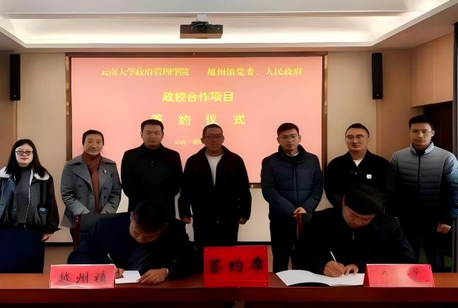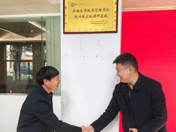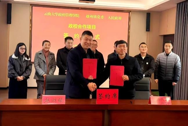 为深入贯彻习近平总书记致云南大学建校100周年重要贺信精神,响应《教育强国建设规划纲要(2024-2035年)》与2026年全国教育工作会议关于政产学研融合赋能拔尖人才培养的工作要求,1月23日,受云南大学政府管理学院党委和行政委托,学院党委副书记马凡松、分管研究生教学副院长孙保全教授、分管本科教学副院长李玫教授、实验实习中心主任谢和均教授、政治学系陈忠言副教授一行,赴曲靖市麒麟区越州镇党委、人民政府签署校地合作框架协议,并为实践育人基地揭牌。越州镇党委 书记徐靖与班子其他成员及相关部门负责人共同出席签约仪式,越州镇党委副书记肖亮同志主持签约仪式。