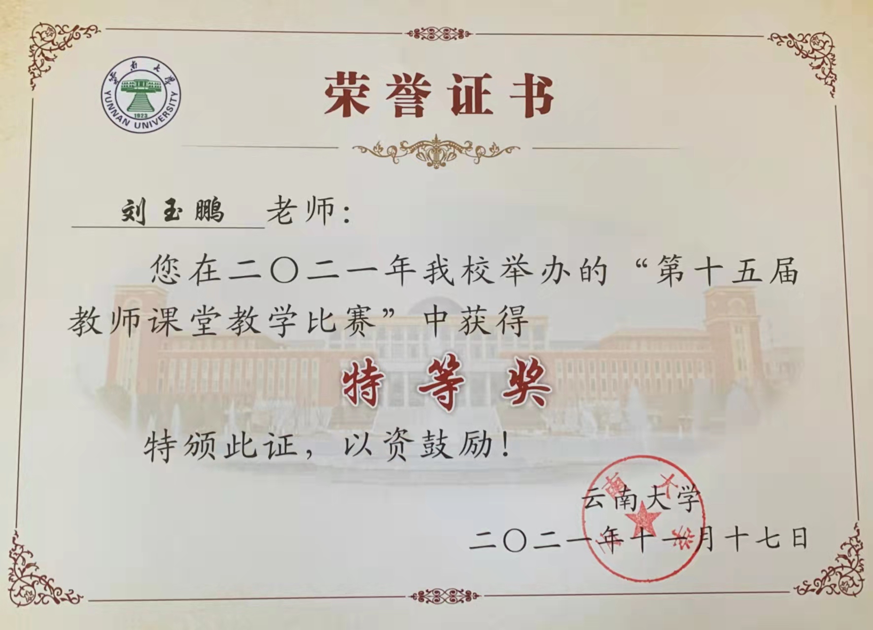 2021年11月12日,由云南大学教务处举办的“云南大学第十五届教师课堂教学比赛”圆满结束,我院哲学系副主任刘玉鹏副教授荣获特等奖。据悉,此次比赛全校共43名选手入围决赛,共决出特等奖2名,刘玉鹏荣膺文科唯一特等奖。
